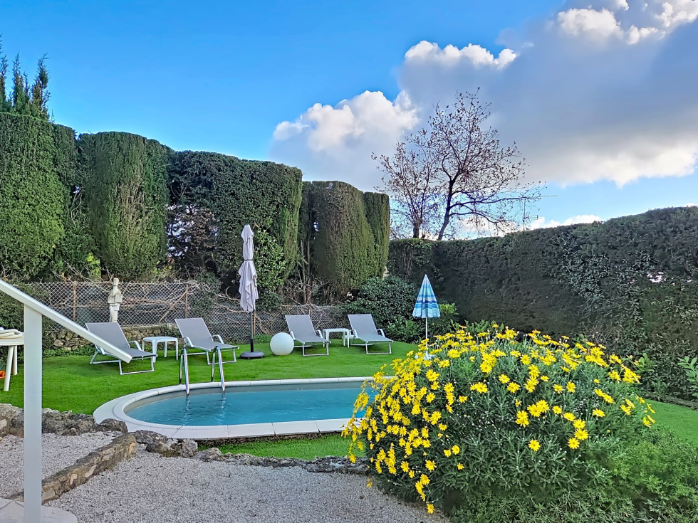 Le jardin d’environ 1 050 m², entièrement clôturé, propose différentes ambiances avec des terrasses couvertes et ouvertes, une piscine, un jacuzzi et des espaces natures.