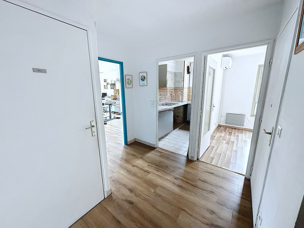 Le bien dispose d’une double exposition dans le séjour, de deux balcons et d’une orientation Nord-Est. La distribution est fonctionnelle : salon et chambre avec parquet récemment refait, climatisation installée, toilettes séparées, cuisine indépendante. Une rénovation est à prévoir sur la cuisine et la salle de bains.