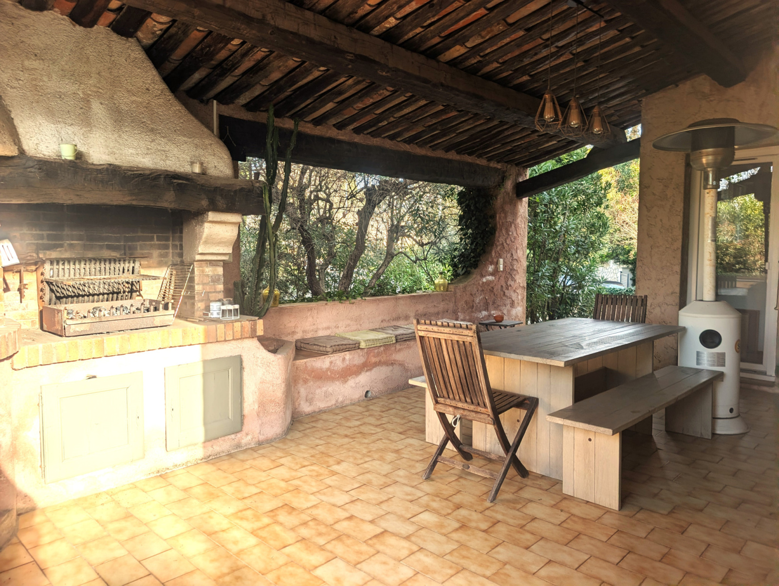 L’entrée dessert un vaste salon, salle à manger avec une cheminée apportant chaleur et convivialité. La cuisine équipée indépendante s’ouvre sur une agréable terrasse abritée, idéale pour les repas en extérieur.