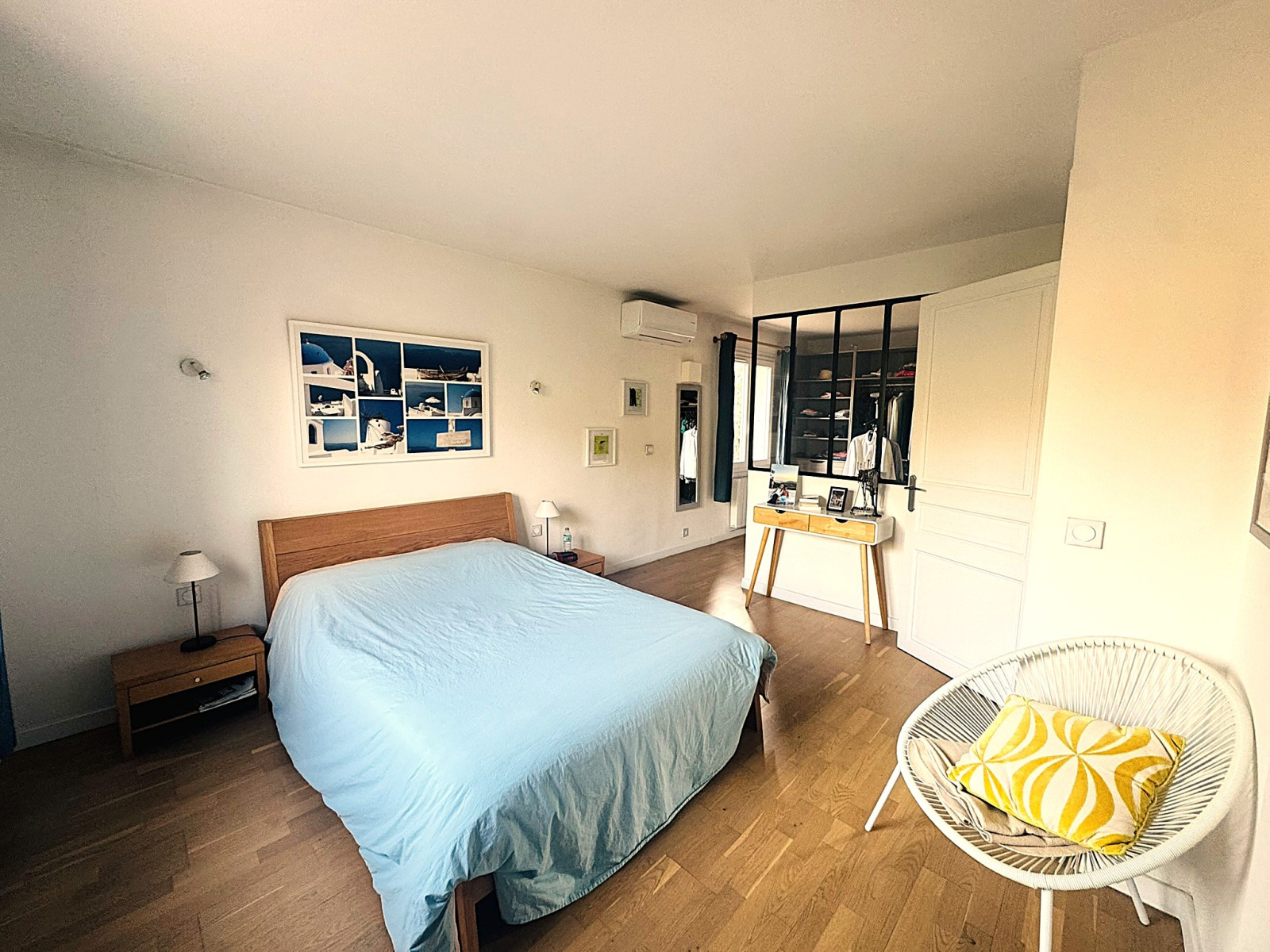 Quelques marches mènent à l’espace nuit principal comprenant une chambre parentale avec salle de bains et grand dressing, ainsi qu’une chambre supplémentaire pouvant faire office de bureau ou de chambre d’amis.