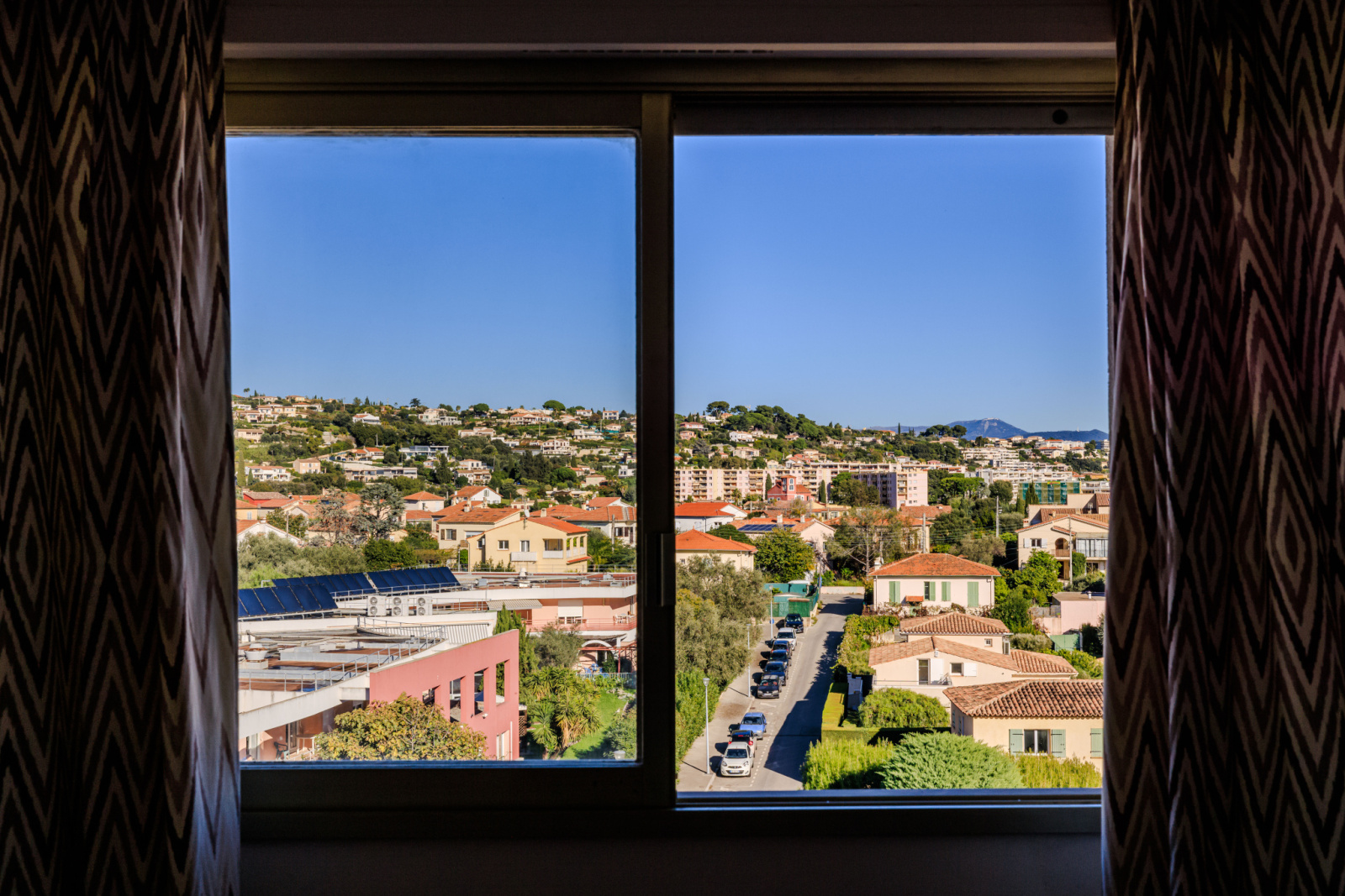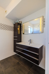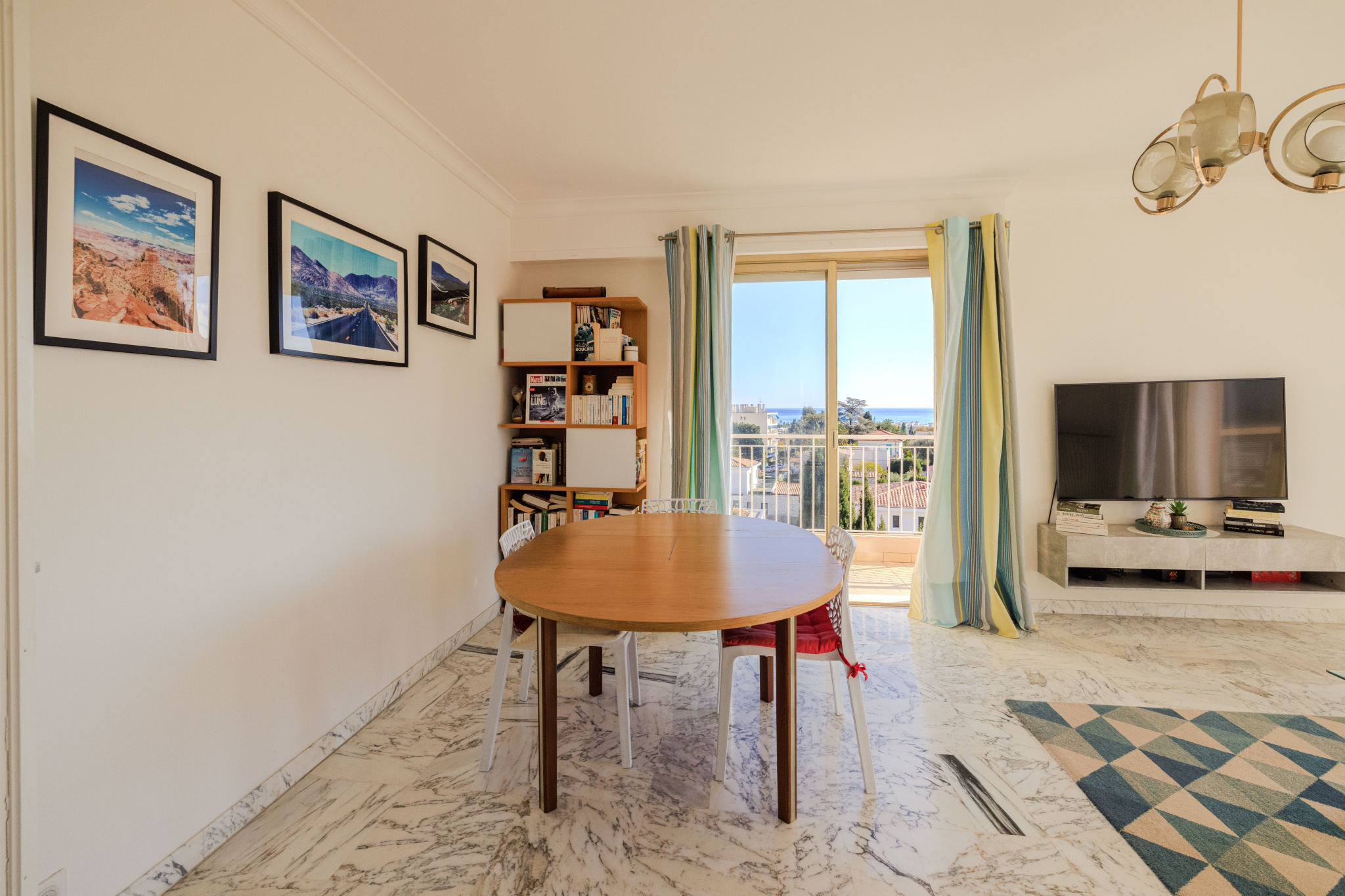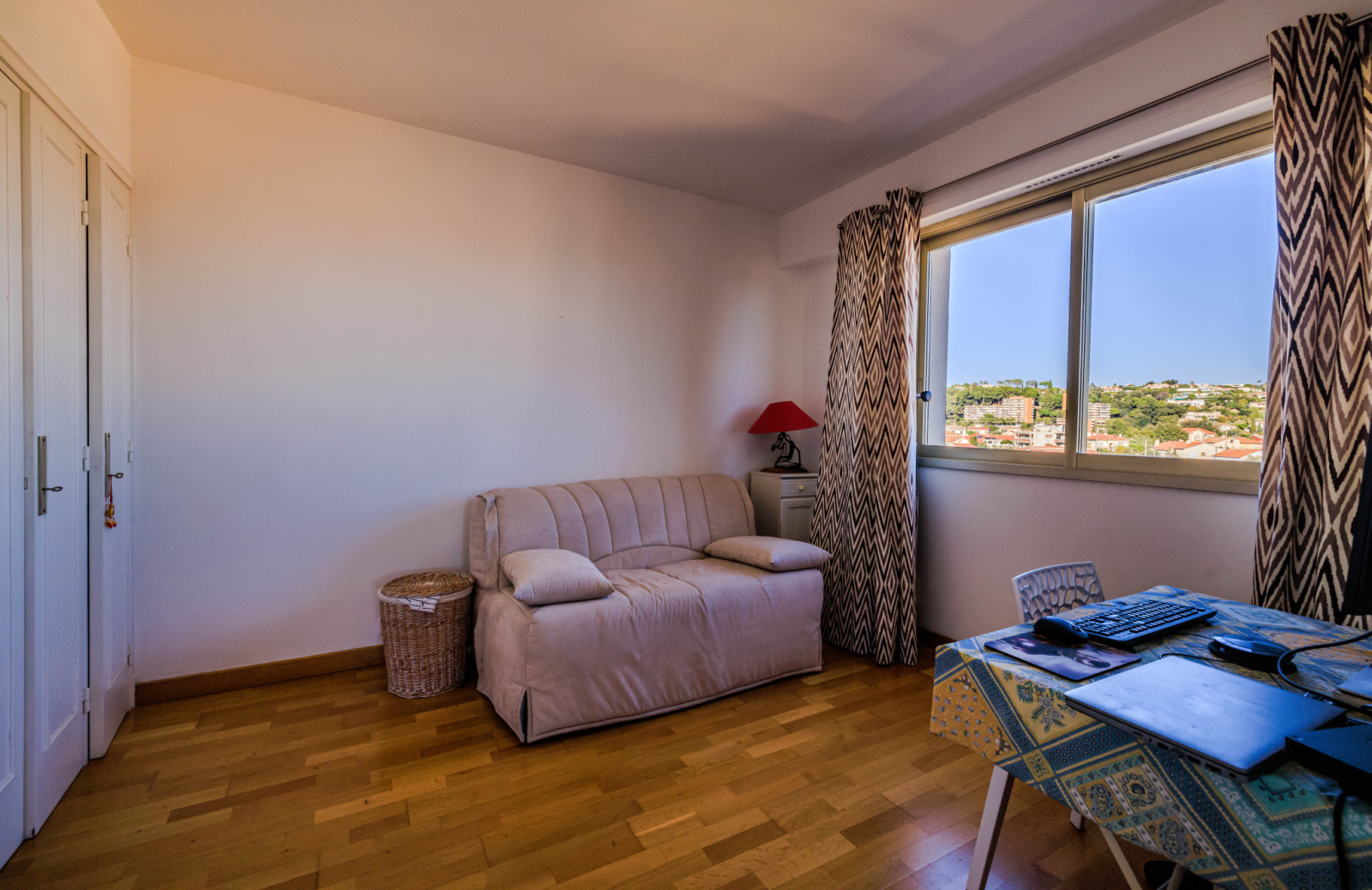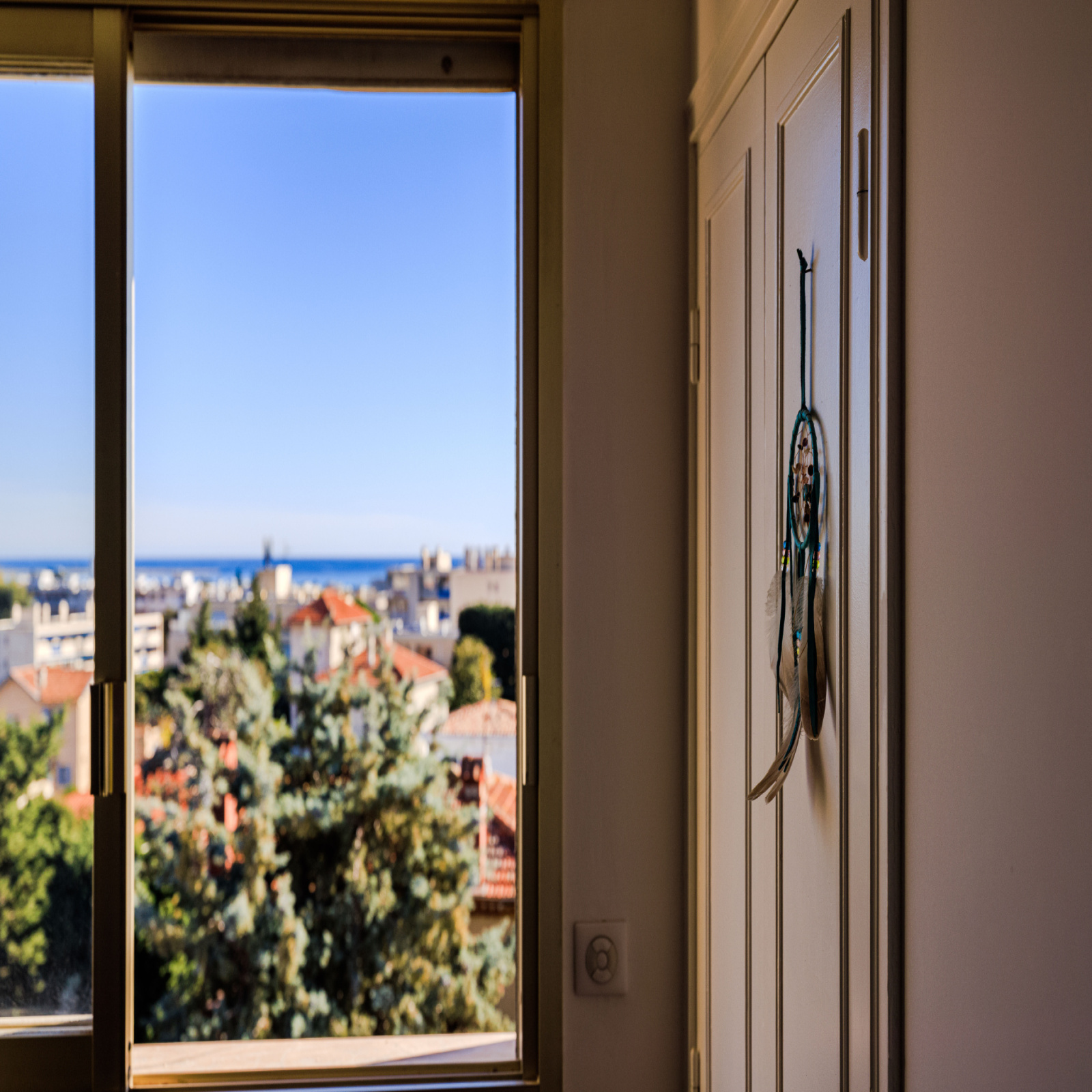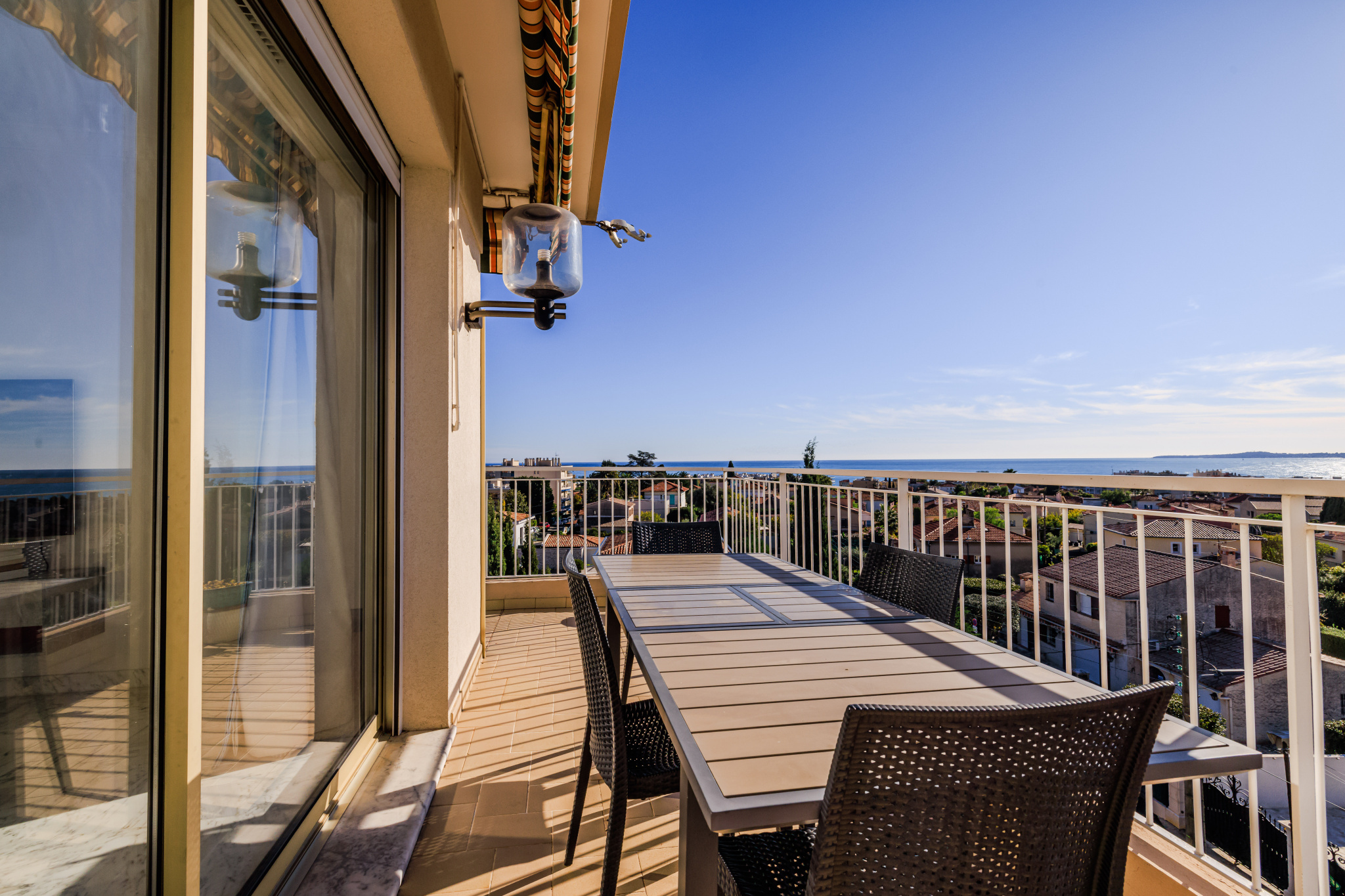 Une vaste terrasse en angle de 15m² offre un espace extérieur avec une vue dégagée sur la mer, les collines, la vieille ville et le Château de Cagnes.