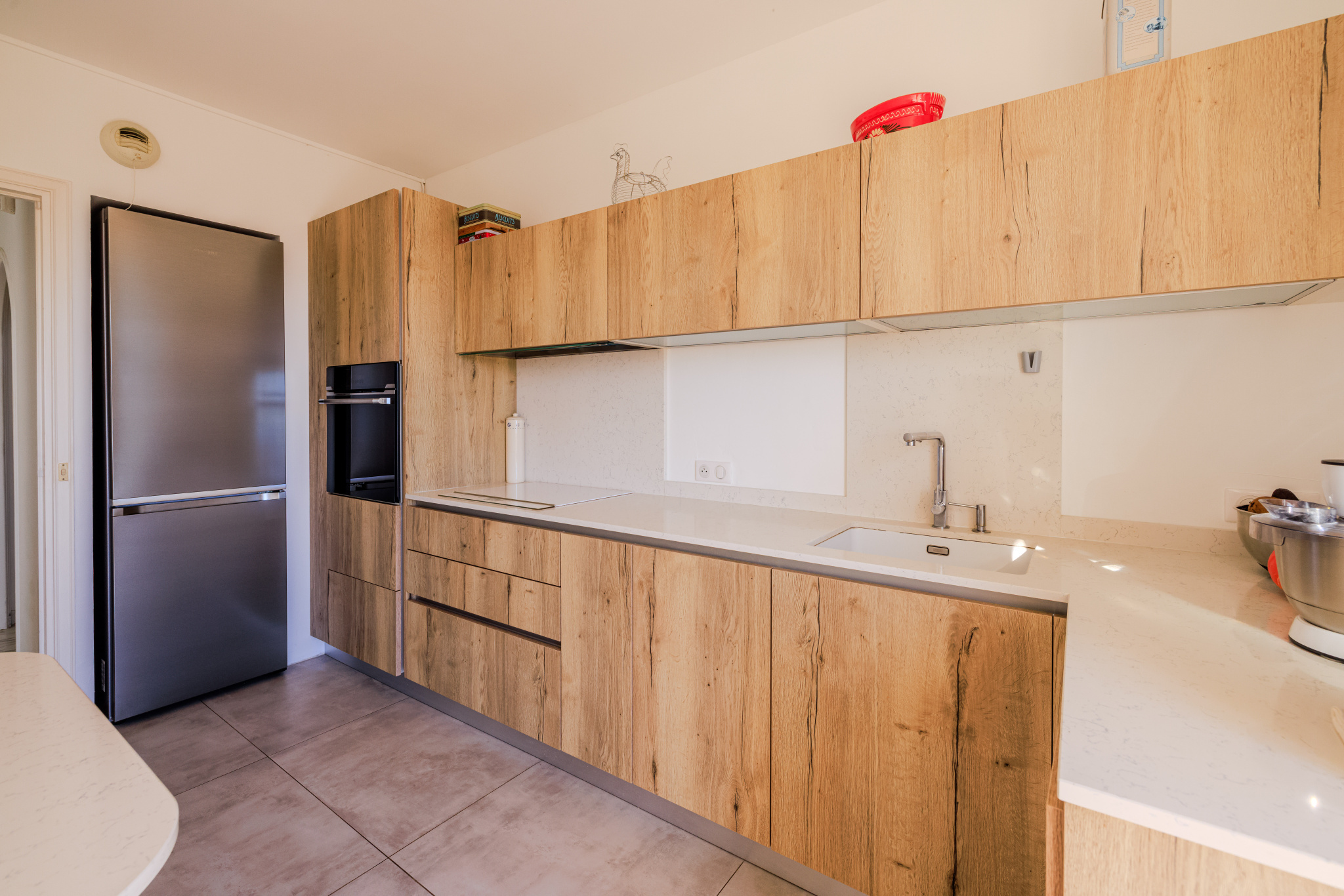 Entièrement rénové avec des matériaux de qualité (sol en bois massif ou marbre, cuisine...), il se compose d'une entrée, d'un séjour de 23 m² en double exposition (sud et ouest), d'une cuisine indépendante équipée, de deux grandes chambres, d'une salle de douche avec fenêtre, et d’un WC séparé.