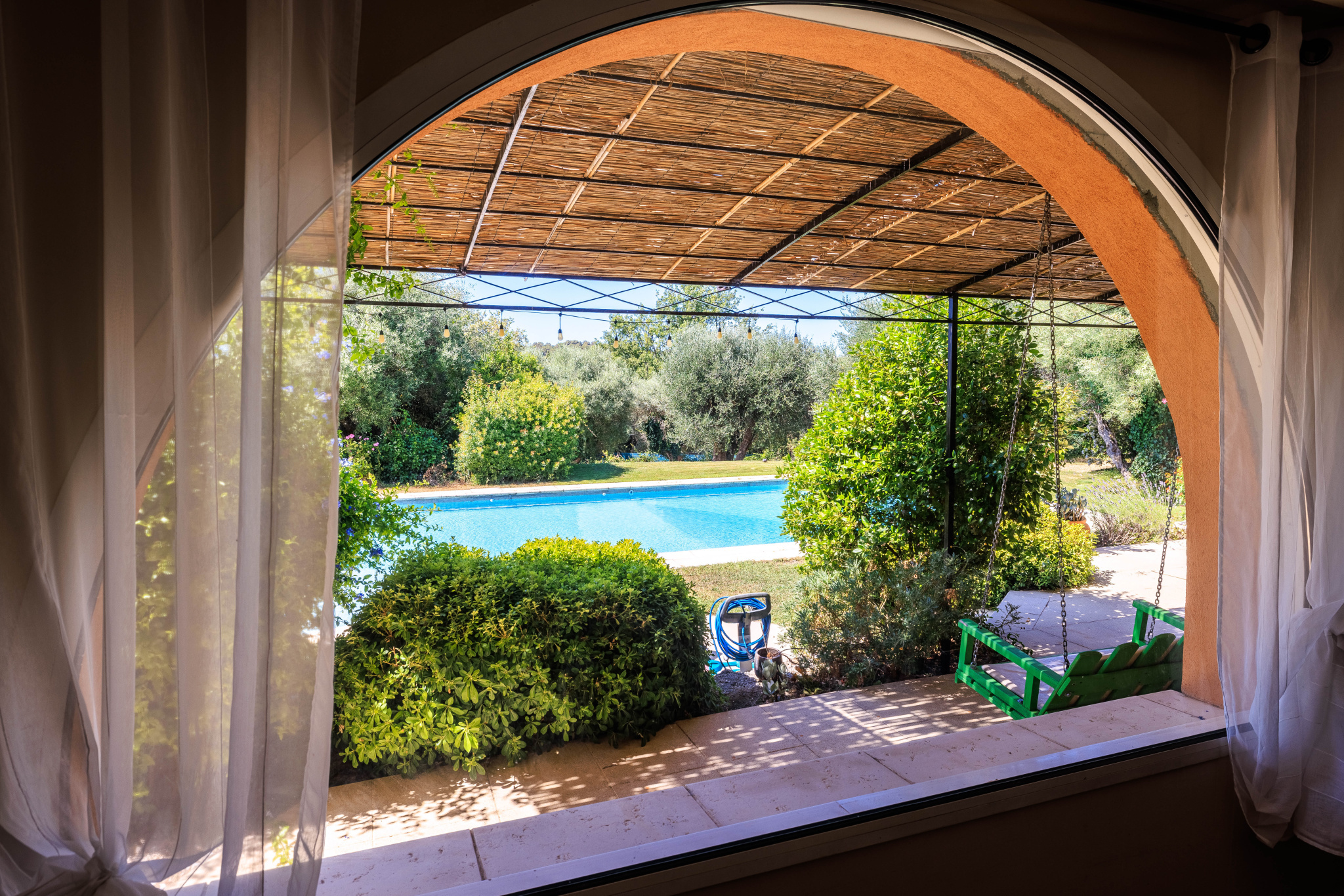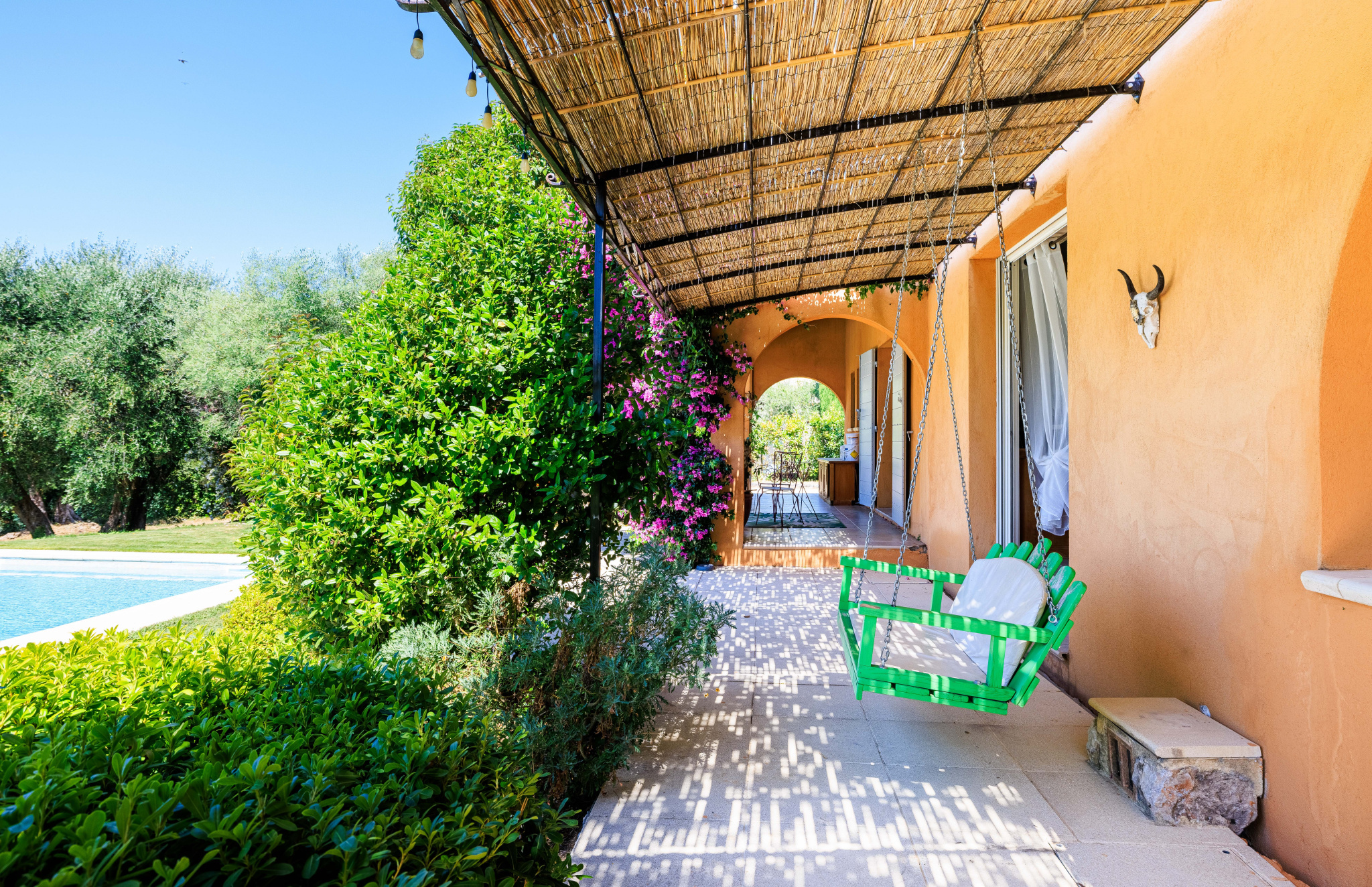 À l’extérieur, le jardin paysager de 3686 m² est une véritable invitation à la détente, aux repas en famille sous le soleil et aux jeux pour les enfants. Une magnifique piscine vient parfaire ce cadre idyllique.