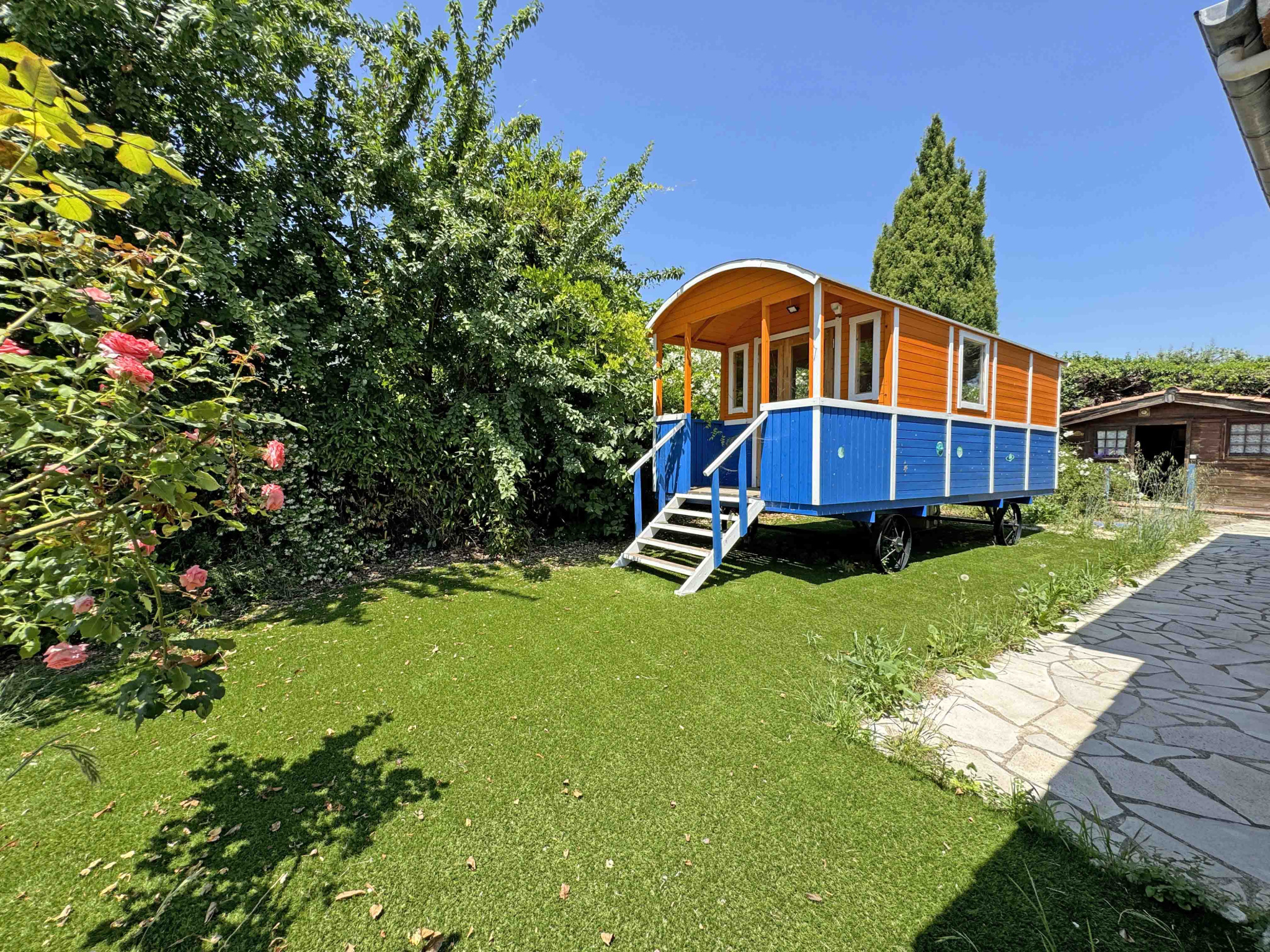 Magnifique vue dégagée sur la mer - Villa de plain-pied et de 113 m2 habitables située à seulement 5 minutes à pied du village de Tourrettes-sur-Loup. Elle offre un terrain privatif de 1.180 m2 avec piscine. Salon, salle à manger avec cuisine ouverte équipée, chambre avec salle de bains et dressing en suite. chambre, salle de douches, WC indépendant avec lave-mains. Grande pièce fermée par veranda. Terrasse couverte avec barbecue. Très jolie roulotte climatisée.