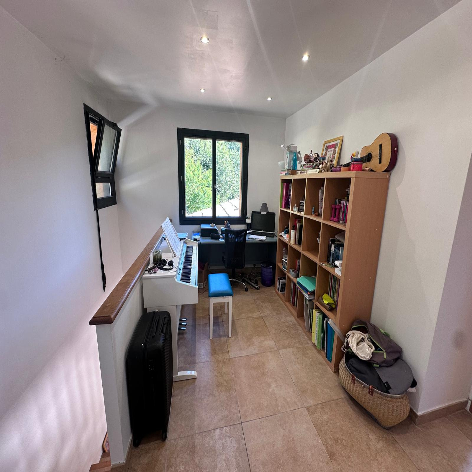 A l'étage : chambre 1 et chambre 2, une salle de bains avec wc, un espace bureau.