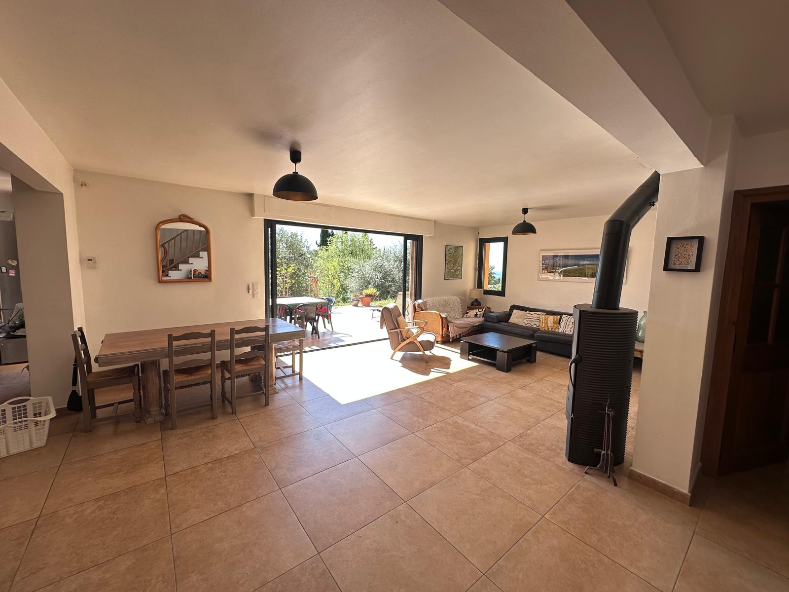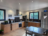 Rez-de-chaussée : une entrée dans beau séjour avec espace salle à manger et avec poele à bois, un wc visiteurs avec lave mains, une généreuse cuisine équipée et ouverte, l'ensemble ouvrant sur une terrasse par une large baie à galandage.