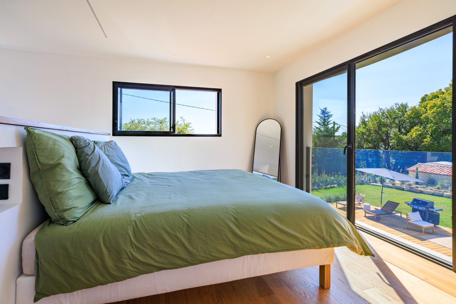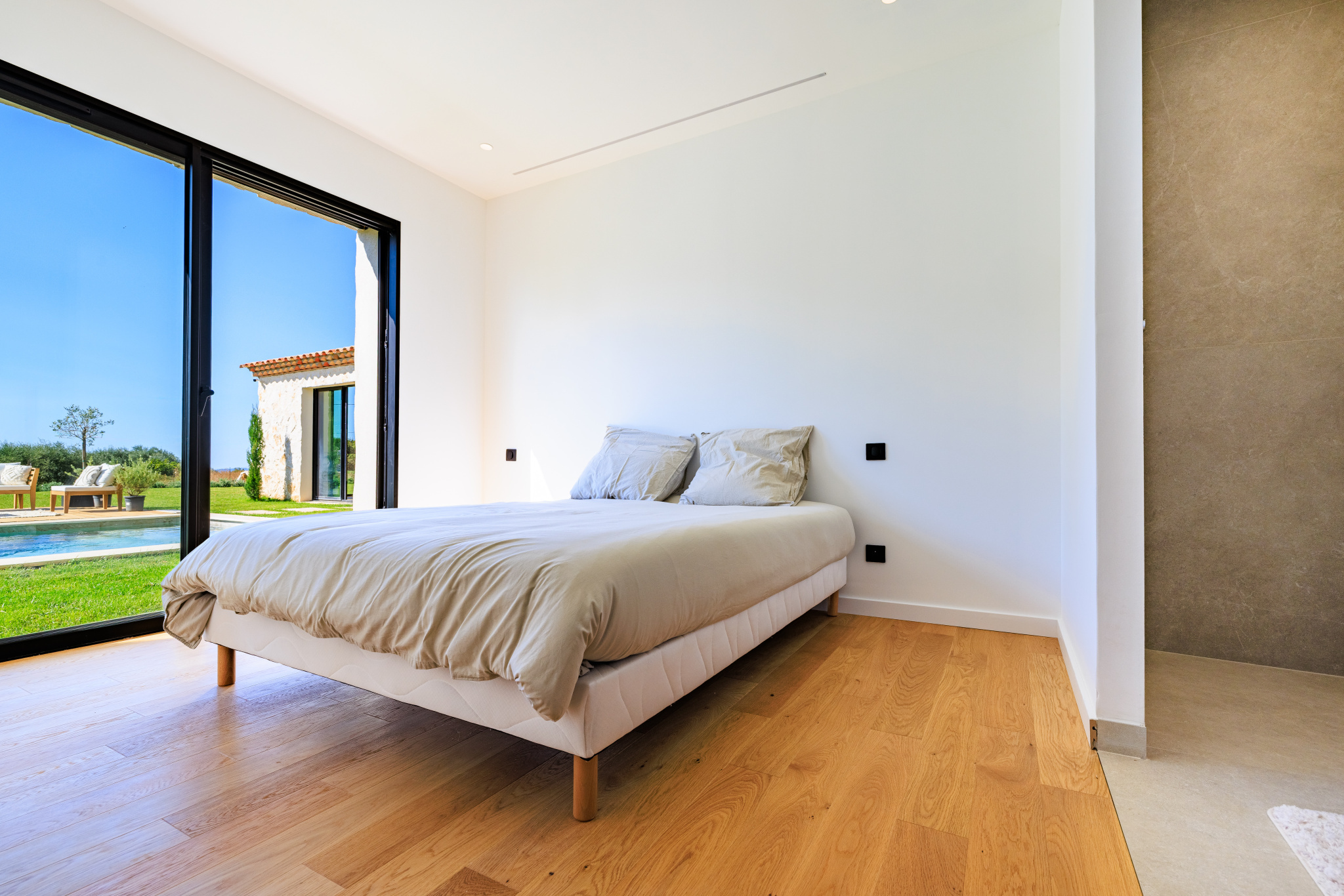 Édifiée récemment, elle s'ouvre sur une vue panoramique à couper le souffle qui embrasse la mer et la campagne environnante. Chaque matin, depuis la suite parentale, le lever du soleil offre un spectacle unique, baignant la maison de lumière dorée.