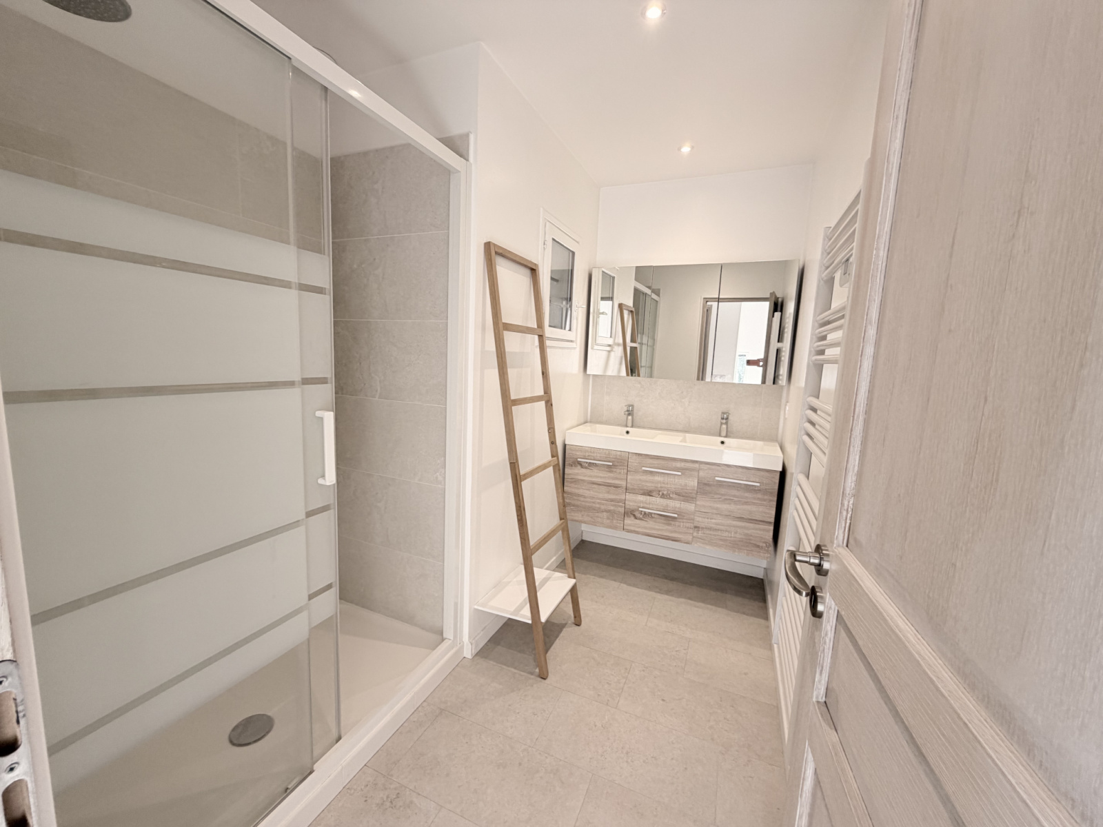 À l’étage, l’espace nuit propose trois chambres, dont une suite parentale avec terrasse privative, ainsi qu’une salle de douche moderne avec double vasque.