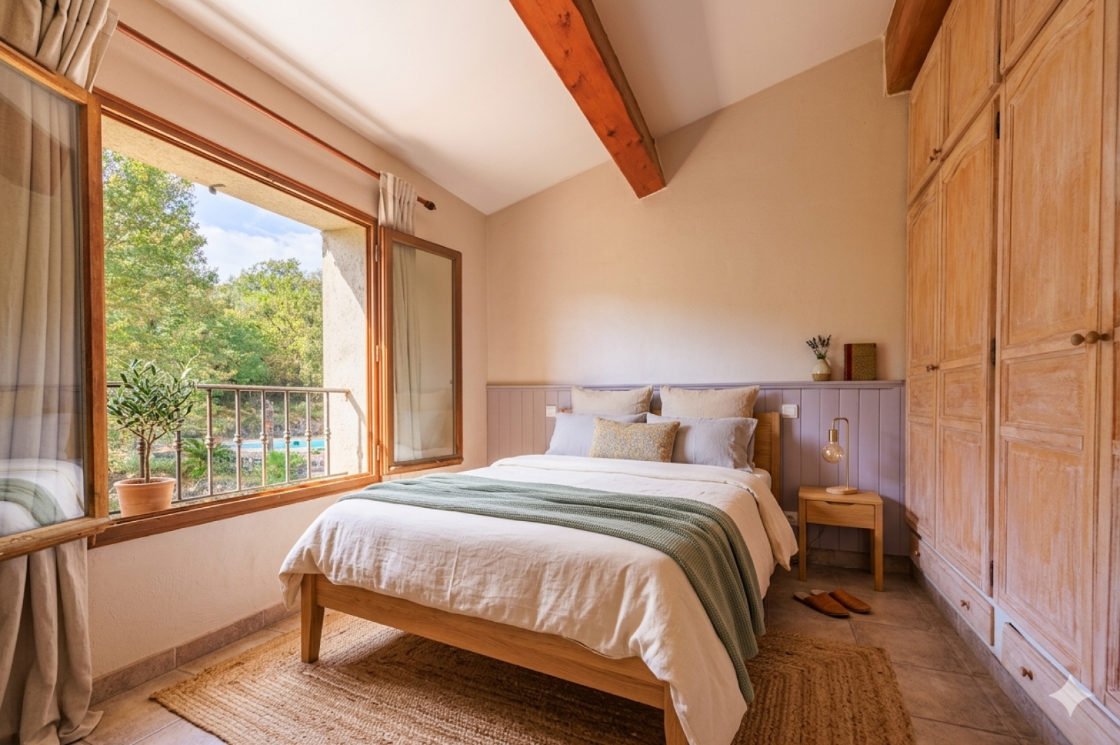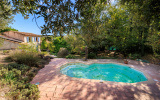 À l’extérieur, un jardin méditerranéen entoure une piscine parfaitement intégrée à l’environnement naturel. Cet espace invite à la détente, aux repas en terrasse et aux longues journées ensoleillées typiques de la région.